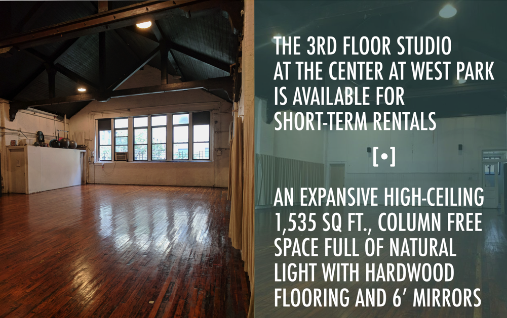 To book this space for performances, events, rehearsals, classes, and more, email info@centeratwestpark.org: