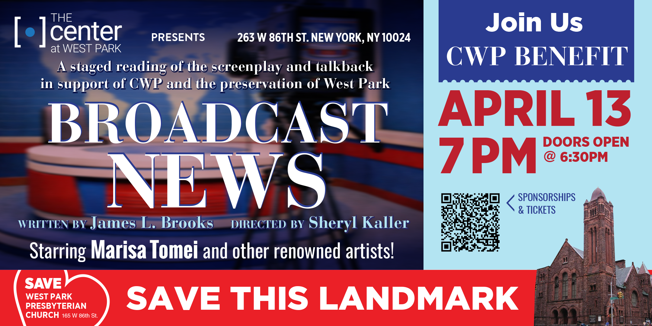 A staged reading benefit of the screenplay of Broadcast News, starring Marissa Tomei and other renowned artists!