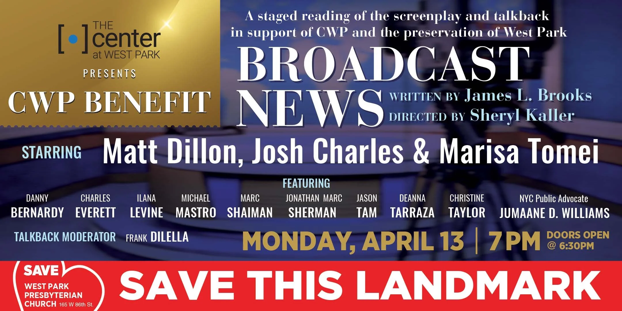 A staged reading benefit of the screenplay of Broadcast News, by James L. Brooks, directed by Tony-nominated director Sheryl Kaller and starring Josh Charles, Matt Dillon, & Marisa Tomei and featuring Danny Bernardy, Charles Everett, Ilana Levine, Michael Mastro, Marc Shaiman, Jonathan Marc Sherman, Jason Tam, Deanna Tarraza, Christine Taylor, NYC Public Advocate Jumaane D. Williams and more renowned artists! The reading will be followed by an audience talkback with the cast led by 12-time Emmy Award winning host of “On Stage”on NY1, Frank DiLella.