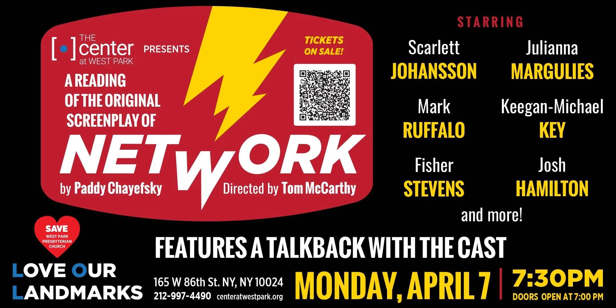 A reading of Paddy Chayefsky's award winning screenplay "NETWORK". The night is directed by Tom McCarthy and stars Mark Ruffalo, Scarlett Johansson, Fisher Stevens, Julianna Margulies & more!