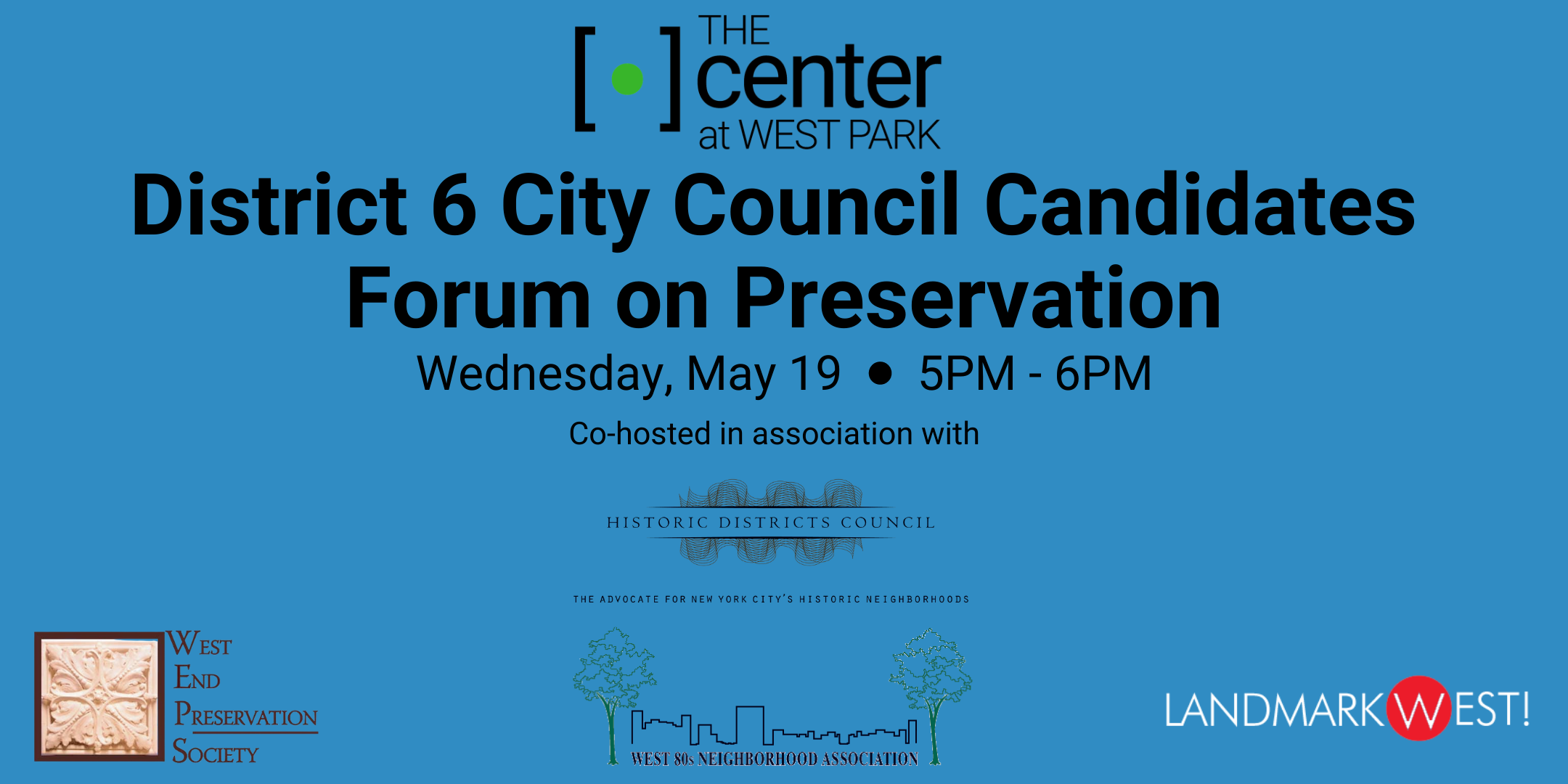 The Center at West Park is holding an Upper West Side virtual neighborhood evening featuring a District 6 City Council Candidates Forum on Preservation on Wednesday, May 19th from 5PM - 6PM. The evening's Forum is presented in association with The Historic District Council (HDC), W80’s Neighborhood Association, West End Preservation Society (WEPS), and the added sponsorship of Landmark West!.