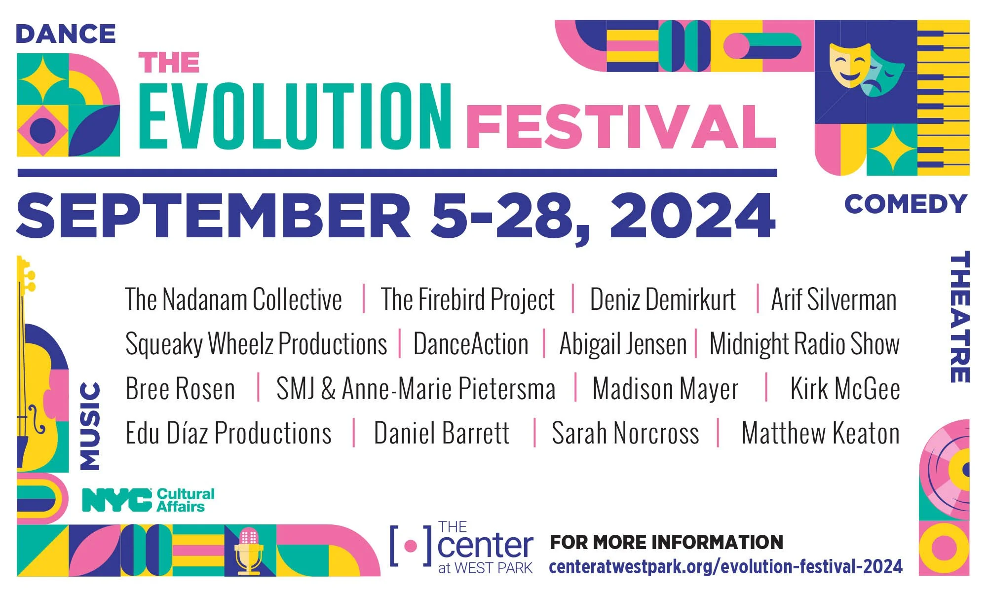 The EVOLUTION FESTIVAL presents original works of theater, dance, music, comedy, and interdisciplinary performance from NYC area artists from September 5-28, 2024 at The Center at West Park in NYC.