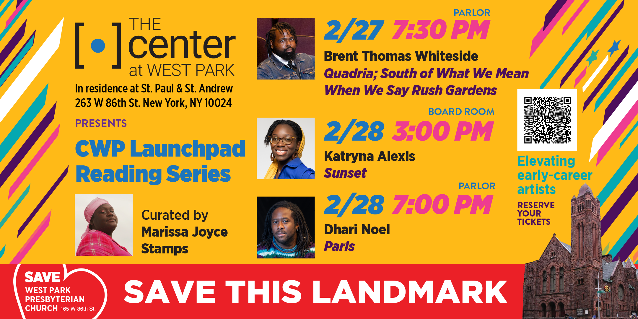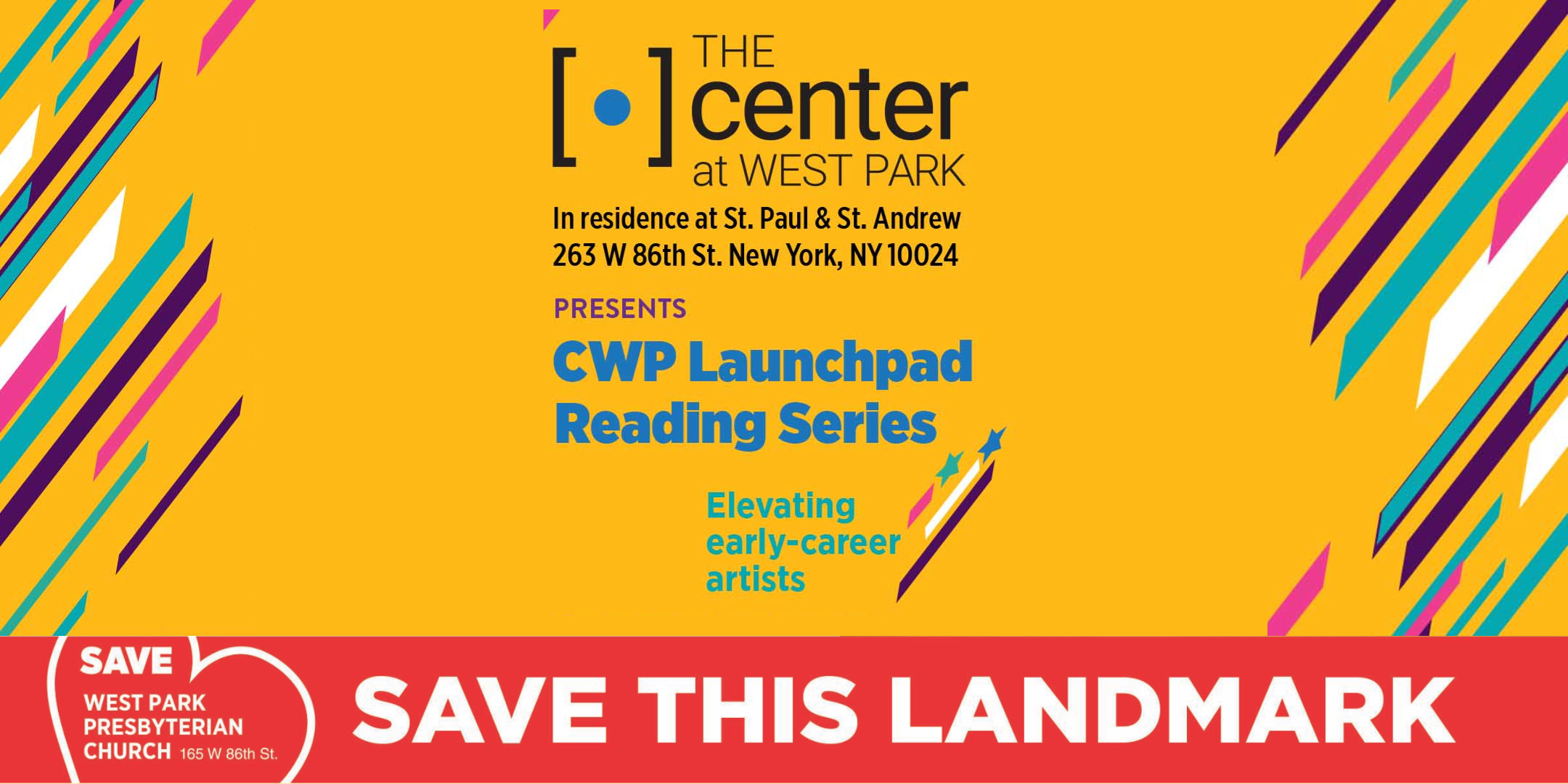 The CWP Launchpad Reading Series is a new initiative produced as part of The Center at West Park's Center for New Work Development. The series provides a platform for emerging theatre companies and early-career producers to curate a weekend of pay-what-you-can developmental readings of new work, with rehearsal and presentation space, marketing & promotional support, technical & administrative assistance, and a curatorial stipend provided by CWP. Through the Launchpad Reading Series, CWP uplifts artists at the start of their careers by creating accessible and inclusive presentation opportunities showcasing diverse talents, and provides the next generation of arts leaders with the support to put their ideas and communities on the stage.