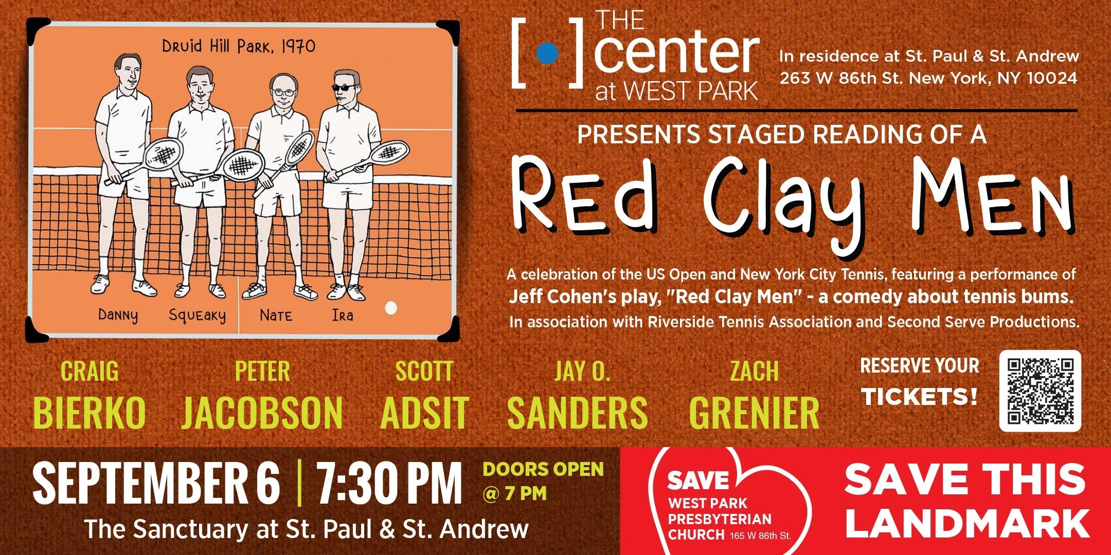 Featuring a performance of Jeff Cohen’s play “RED CLAY MEN” -a comedy about tennis bums- With an award-winning cast including Craig Bierko (Tony nominee,Cinderella Man,Boston Legal), Peter Jacobson (Dr. Taub on “House”) Scott Adsit (30 Rock, Baymax in Disney’s “Big Hero 6”), Jay O Sanders (Drama Desk and NY Drama Critics Award, “Nova”), and Zach Grenier (Tony nominee, “The Good Wife”/ “The Good Fight”).