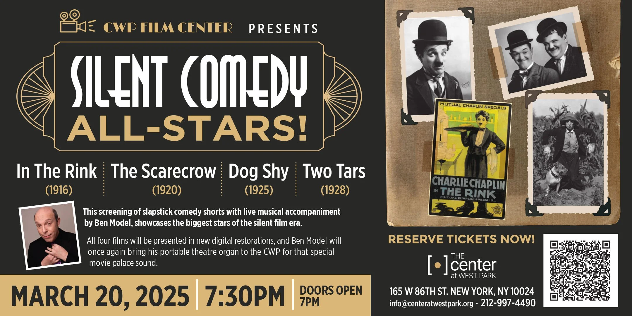 Could you use a good laugh? This screening of slapstick comedy shorts—with live musical accompaniment by Ben Model—showcases the biggest stars of the silent film era. In THE RINK (1916) Charlie Chaplin is a waiter who goes to a roller-skating rink to unwind. THE SCARECROW (1920) finds Buster Keaton down on the farm, vying for the hand of the farmer’s daughter. In DOG SHY (1925) Charley Chase battles cynophobia to save a young woman from marrying a nobleman she doesn’t like, and in TWO TARS (1928) Stan Laurel & Oliver Hardy are a pair of sailors on shore leave who head out for a joyride—and wind up in a hilarious traffic jam. All four films will be presented in new digital restorations, and Ben Model will once again bring his portable theatre organ to the CWP for that special movie palace sound.